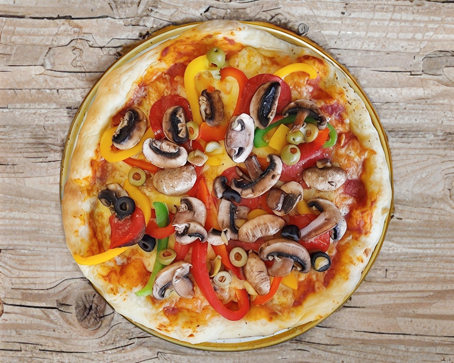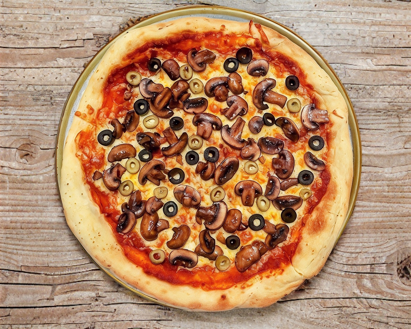 Pizza de 22 cm, masa fina y crujiente con salsa de tomate casera, queso manchego, champiñones al ajillo, aceitunas verdes y negras.