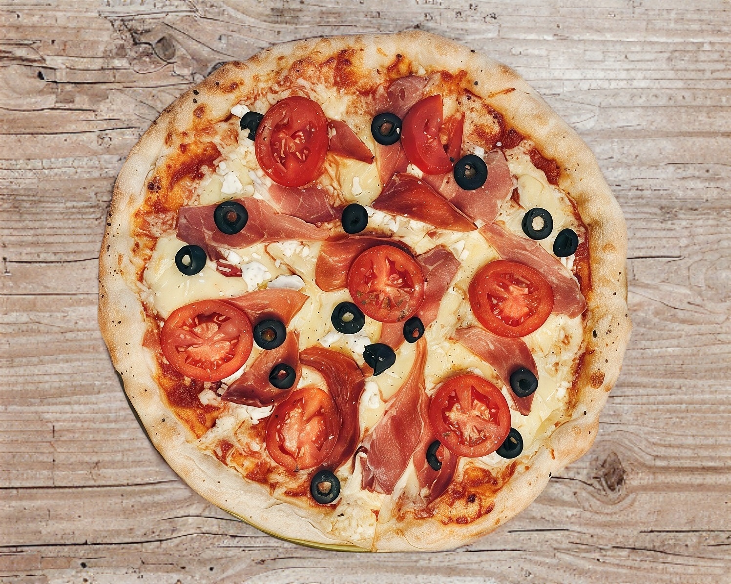 Masa fina y crujiente con salsa de tomate casera, queso manchego, queso de cabra, jamón serrano, aceitunas negras y rebanadas de jitomate.