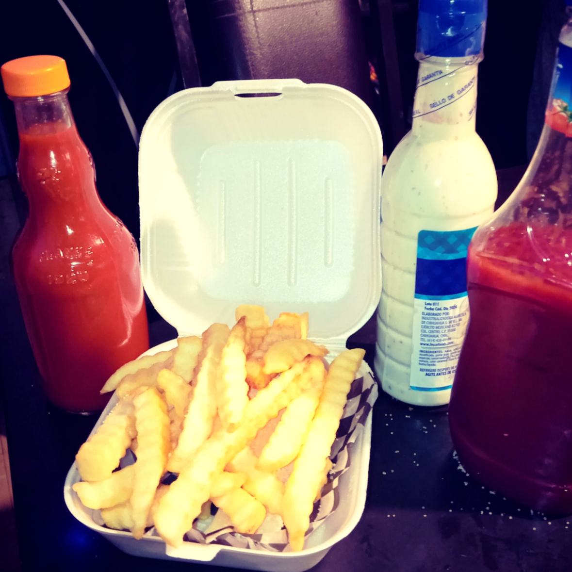 PAPAS Y SALCHICHAS ACOMPAÑADAS DE QUESO AMARILLO CATSUP ADEREZO O SALSA VALENTINA