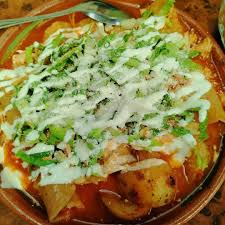 totopos bañados en delicioso mole poblano, acompañados con porcion de pollo, queso, crema y ajonjoli