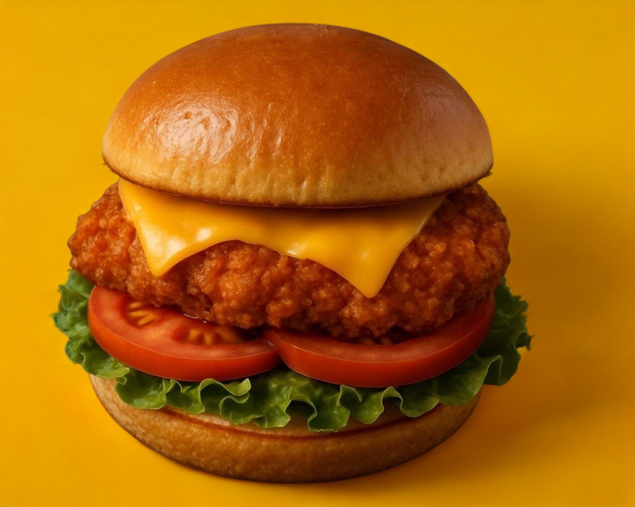 Hamburguesa con carne de pollo estilo crujiente con cebolla caramelizada, lechuga, queso americano, jitomate, aderezo de la casa y porcion de papas a la francesa.
