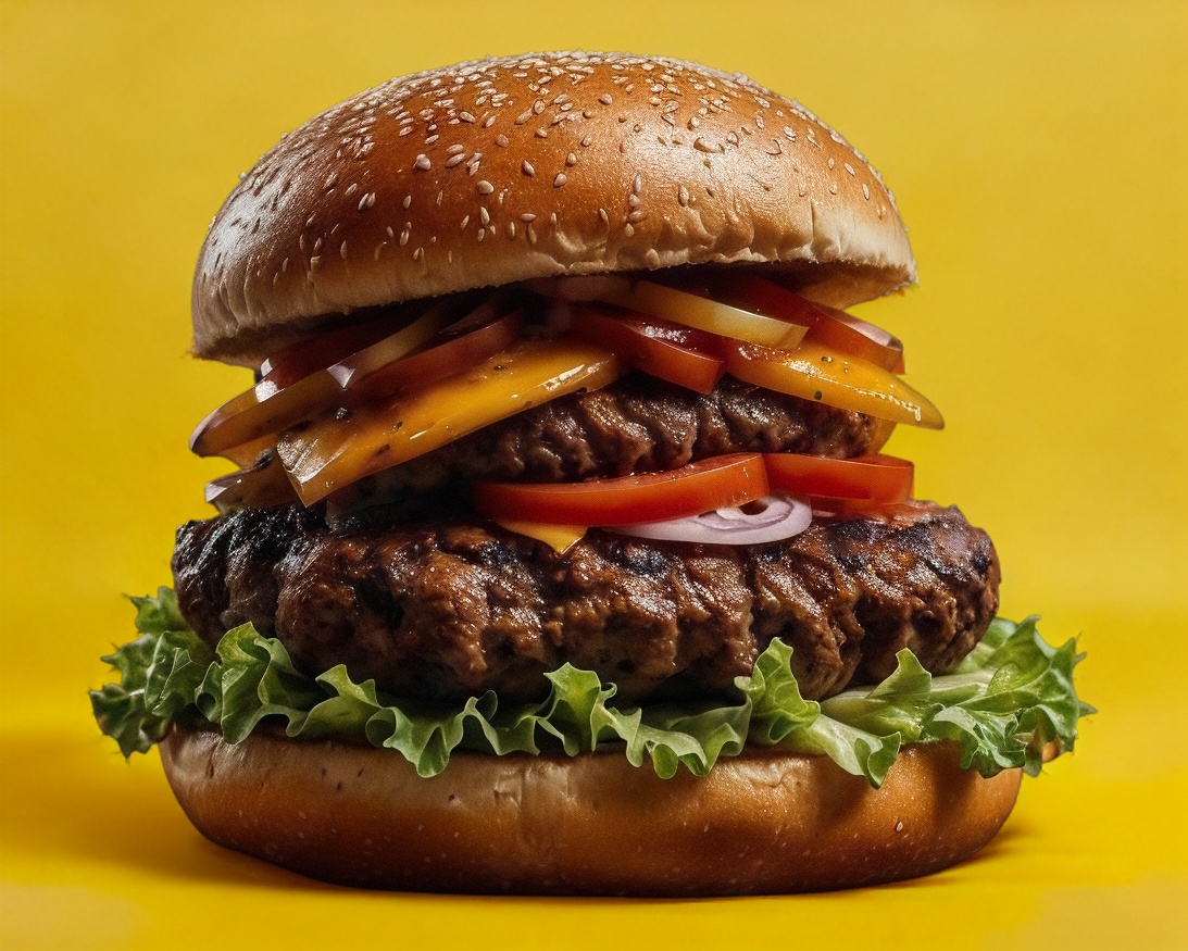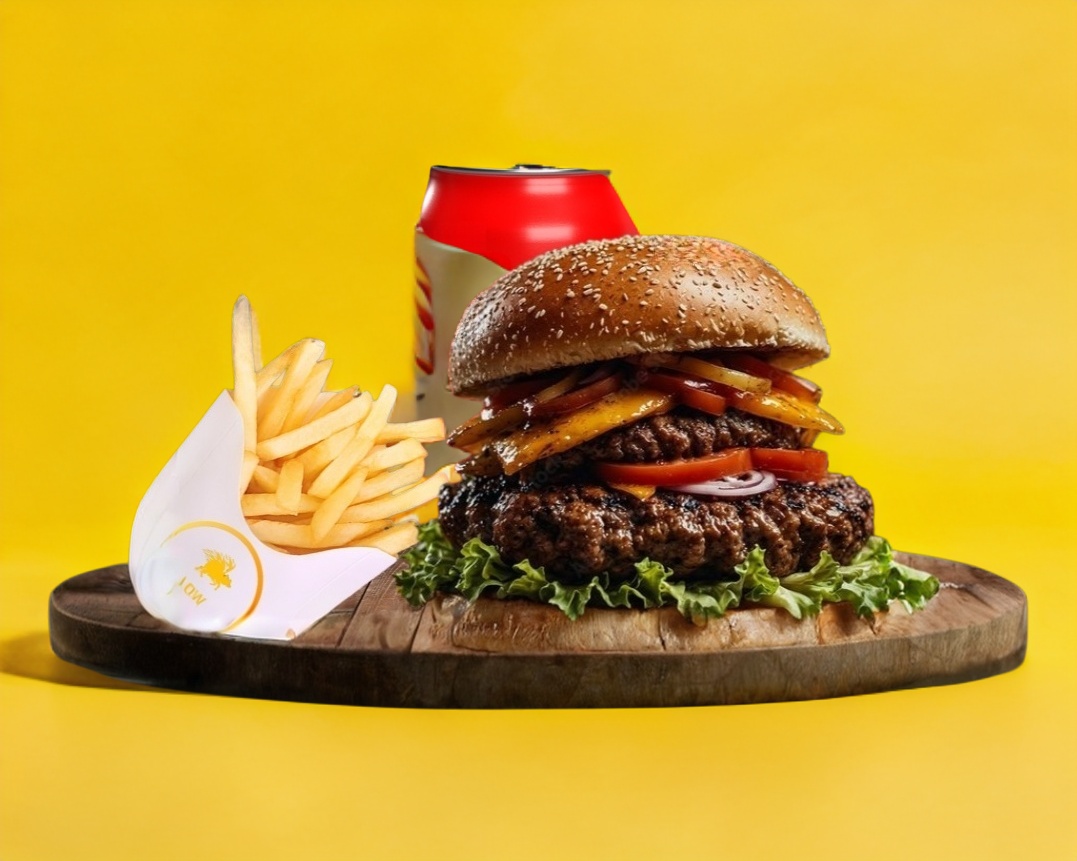Hamburguesa con 2 carnes moldeada estilo sirloin, cebolla caramelizada, lechuga, queso amarillo, jitomate, aderezo de la casa, papas a la francesa y un refresco.