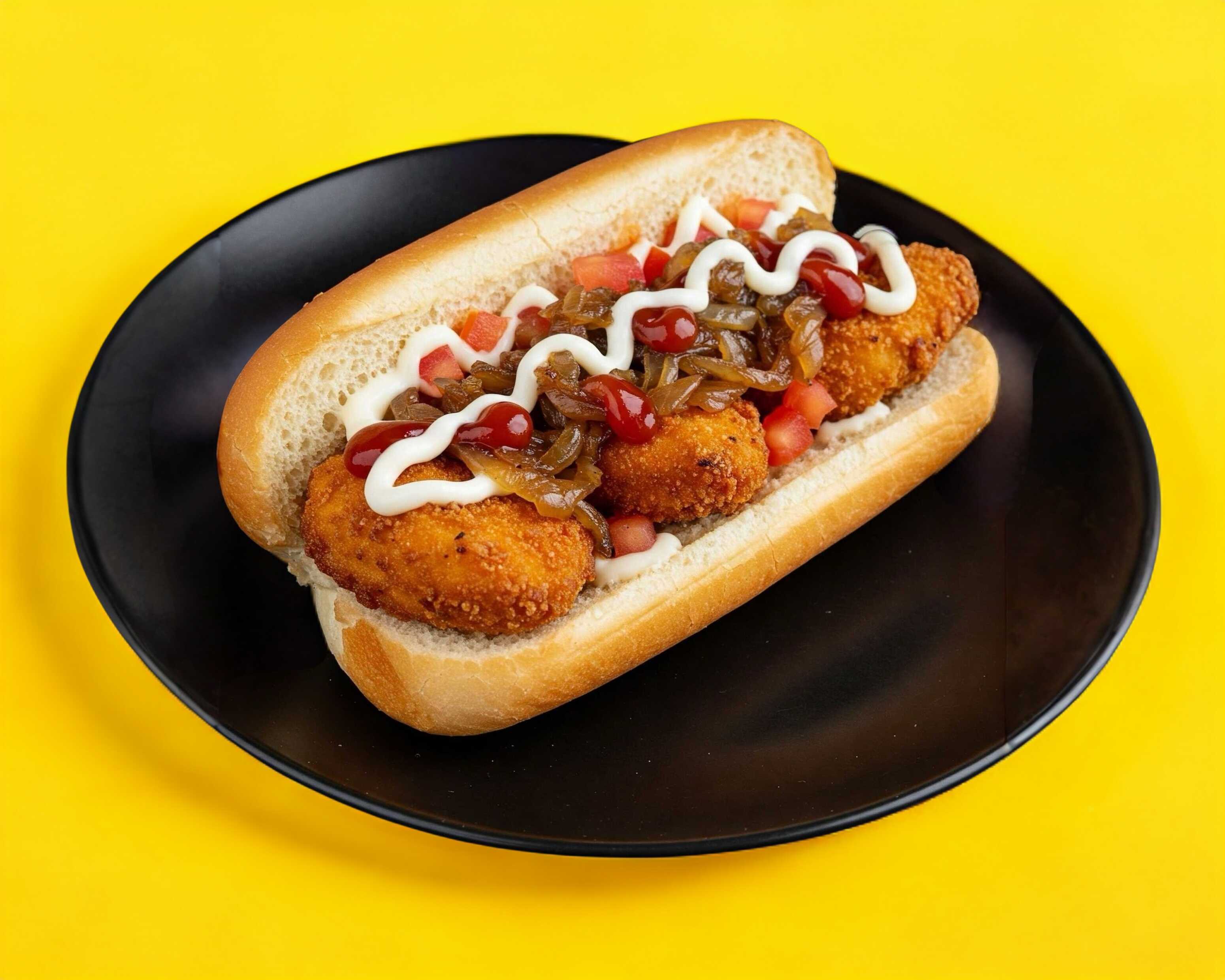 3 piezas de boneless bañados en la salsa de su eleccion, anidados en un pan suave y ligeramente tostado, sobre ella se extiende generosamente una cebolla caramelizada con el toque de cremosidad del aderezo ranch y toque acido de catsup y frescura del jitomate, y acompañada de una porcion de papas.
