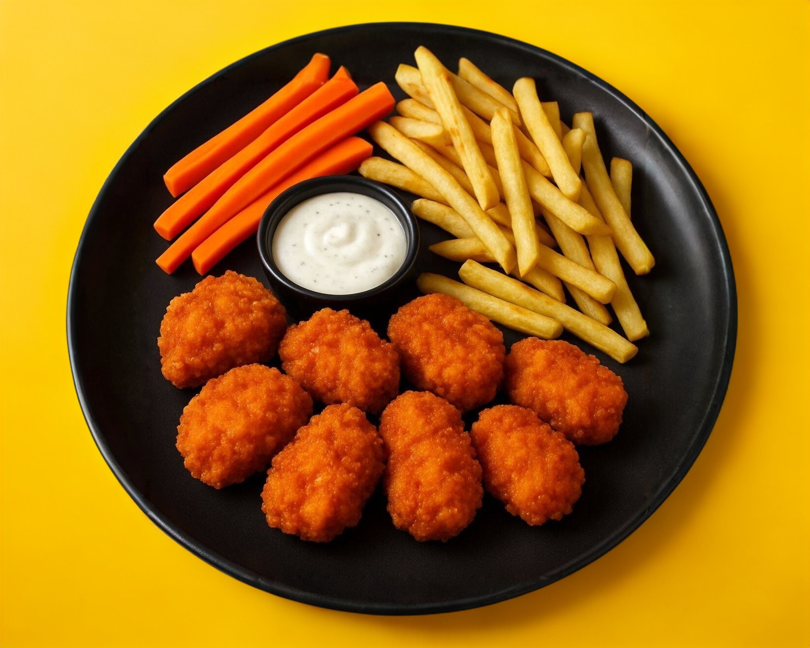 6 Boneless de carne de pollo sin hueso empanizado, bañadas en 2 la salsa a elegir más porción de papas a la francesa más porción de zanahorias más aderezo ranch.