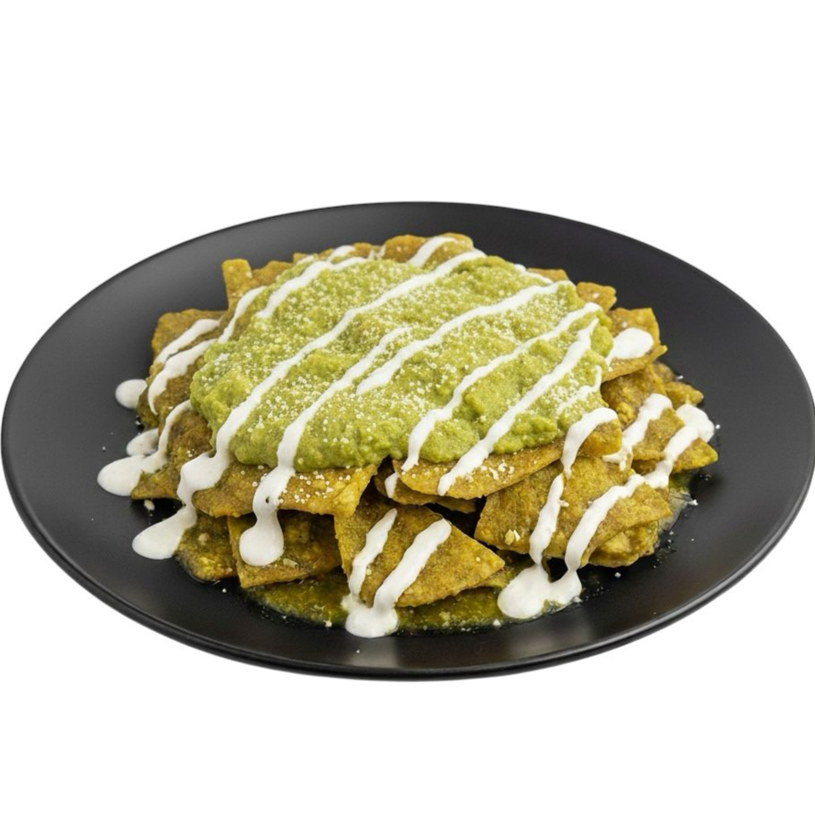 Un clásico mexicano que despierta los sentidos. Totopos de maíz recién fritos, con su inconfundible textura crujiente, son sumergidos en una vibrante y aromática salsa verde.