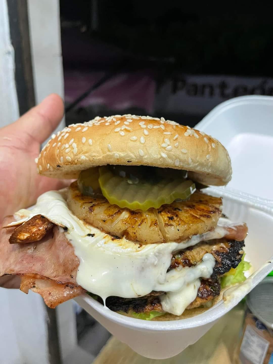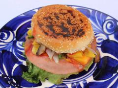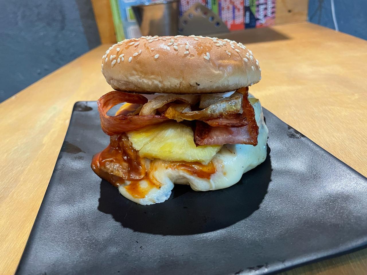 Hamburguesa con queso manchego, jamón, tocino, lechuga, jitomate, cebolla, catsup, mostaza y piña, dulce, jugosa y tropical.