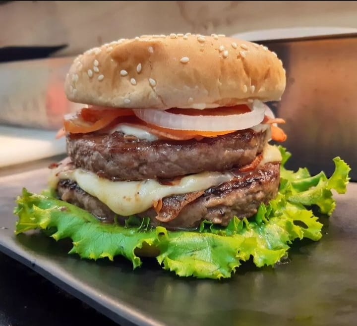 Hamburguesa doble con 250 g de proteína, queso amarillo, tocino, jitomate, cebolla, catsup y mostaza, para los verdaderos amantes de la carne.