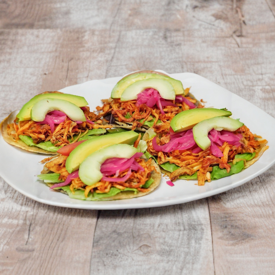 4 tacos sazonados con cebolla, salsa mexicana y aguacate