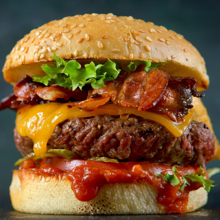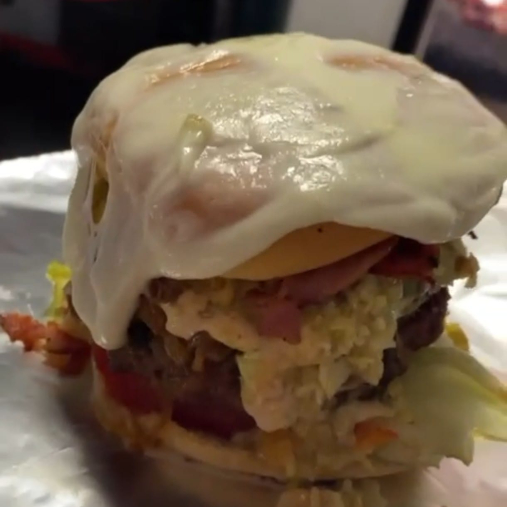 Pan, lechuga, tomate, cebolla caramelizada, jugosa carne, ripio de papa, salsas (rosada piña y verde) y queso fundido sobre toda la hamburguesa
