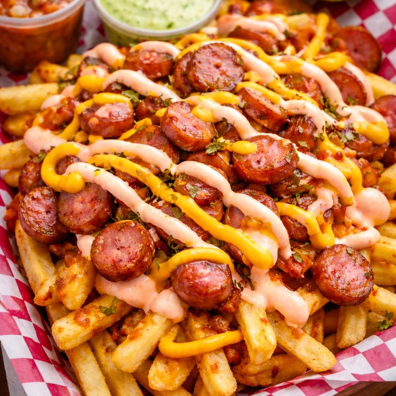 Papa, salchicha ranchera, queso fundido y salsas (rosada piña verde)