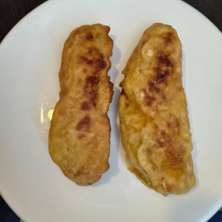 Pan, lechuga, tomate, cebolla caramelizada, pollo empanizado, ripio de papa, queso fundido y salsas (rosada, piña y verde)