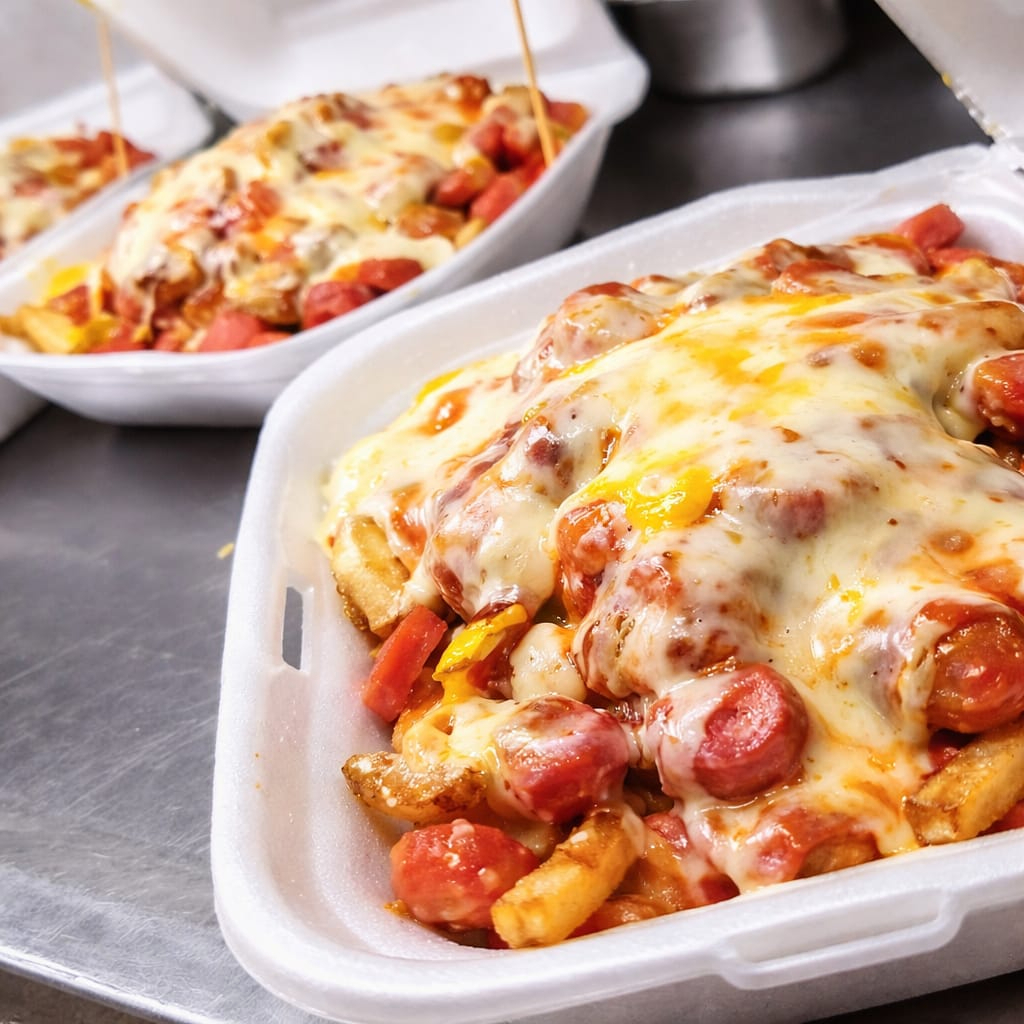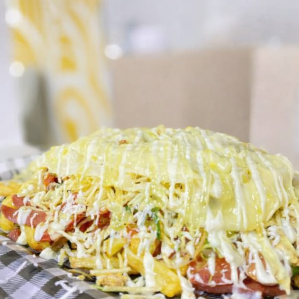 Papa, salchicha ranchera, pollo deshebrado, carne deshebrada, tocineta, maicitos, queso fundido y salsas (piña, verde, rosada)