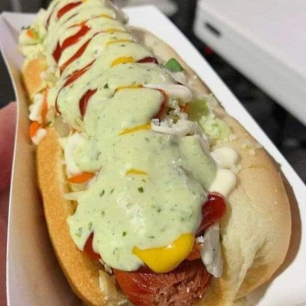Pan, salchicha ranchera, cebolla caramelizada, tocineta, ripio de papa, queso fundido y salsas (piña verde y rosada)