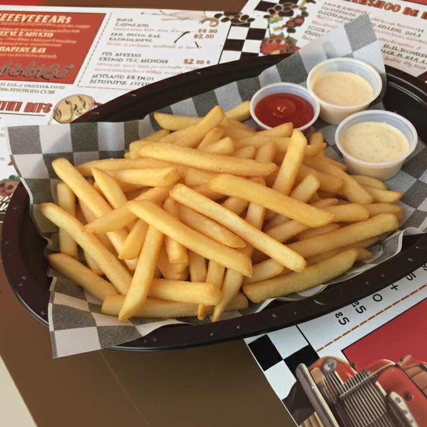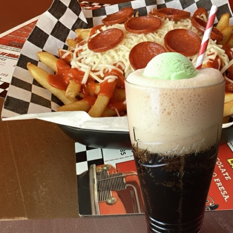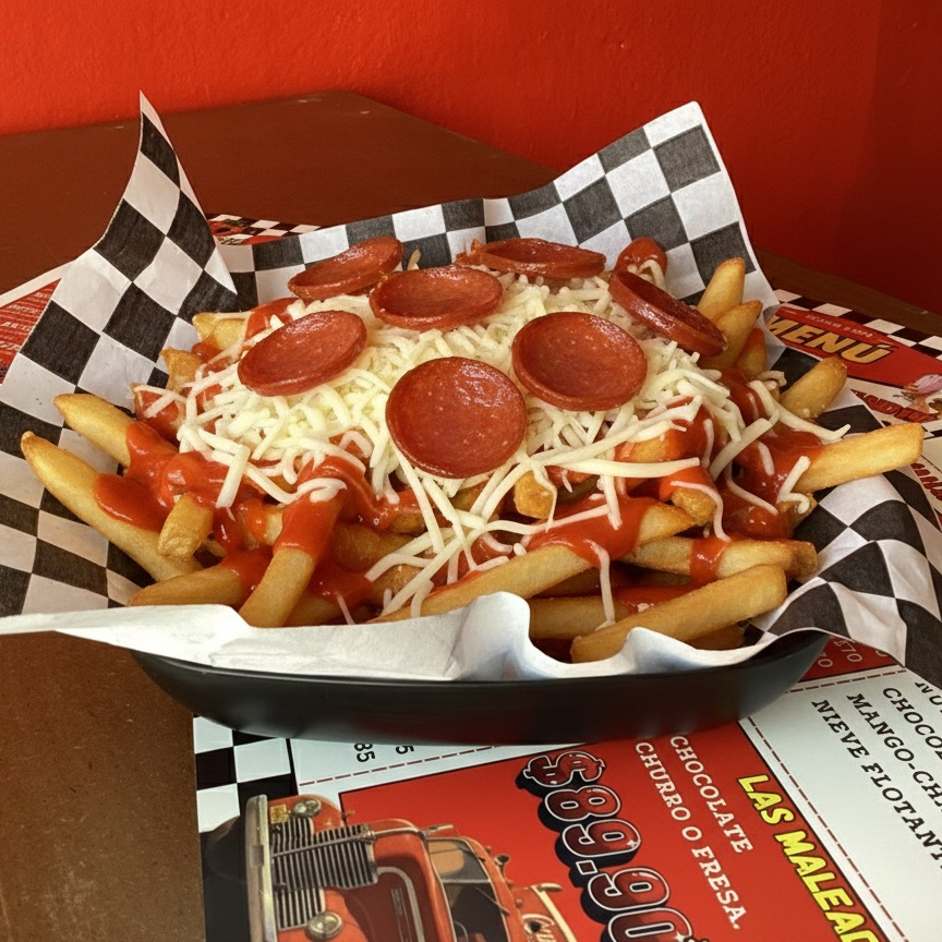 Papas fritas, salsa pomodoro, con queso Gouda y peperonni