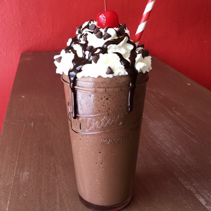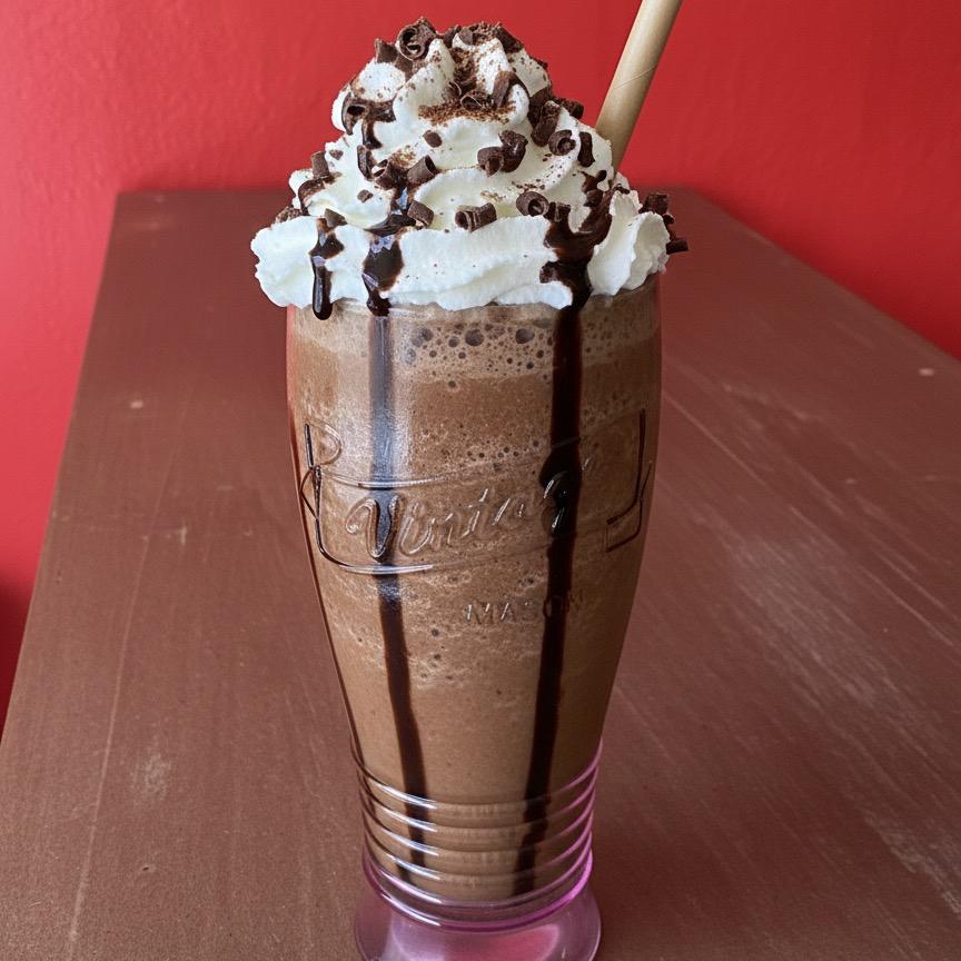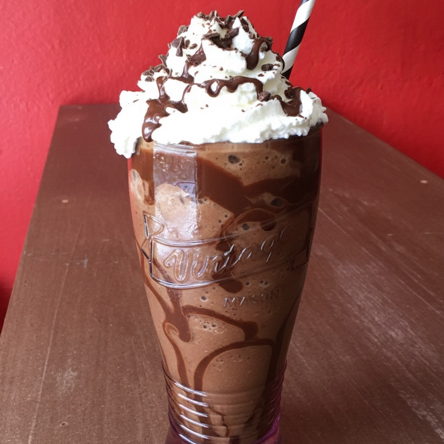 Helado de chocolate oscuro, leche y salsa de cacao, mezclados hasta ser extra espesos. Cubierta con crema batida y un drizzle de chocolate.