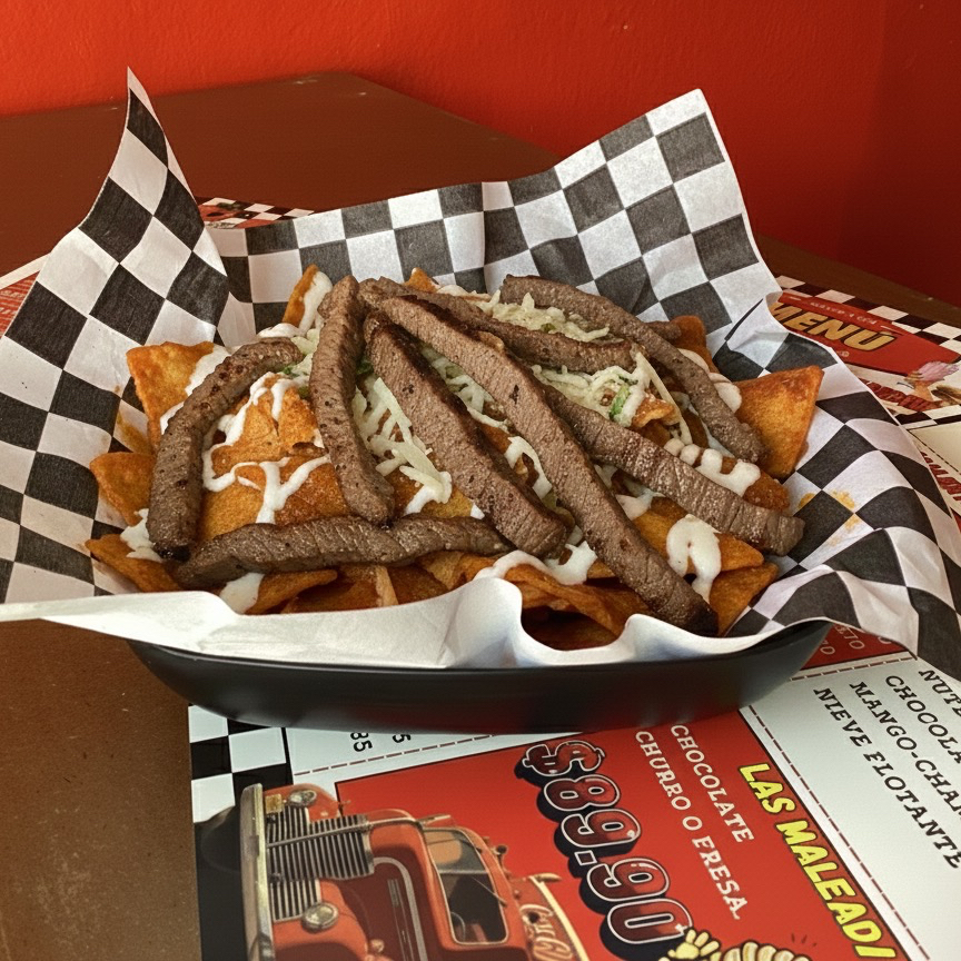 Papas fritas bañadas en frijoles refritos con chorizo, queso Gouda y jalapeño