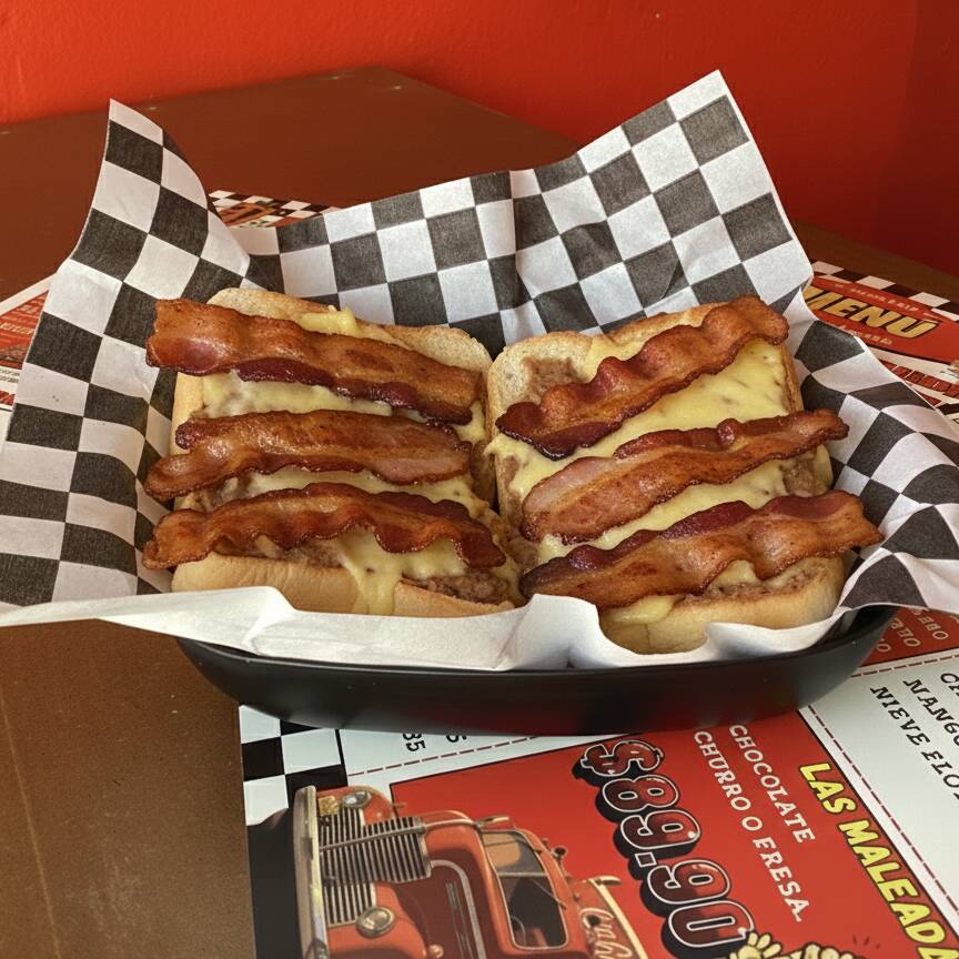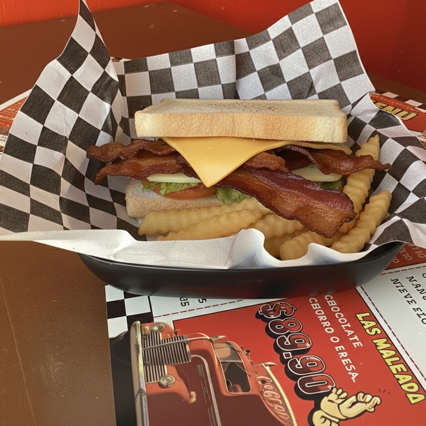 Sándwich con tocino, queso Gouda, queso Americano y mayonesa