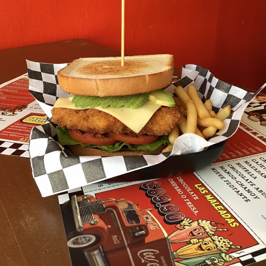 Sándwich con tiras de pollo empanízalas, lechuga, jitomate, queso Gouda, aguacate y aderezo de mayonesa
