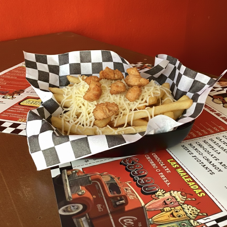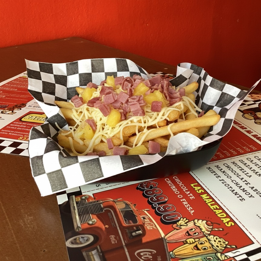 Papas fritas con jamón, piña, bañadas en queso Gouda