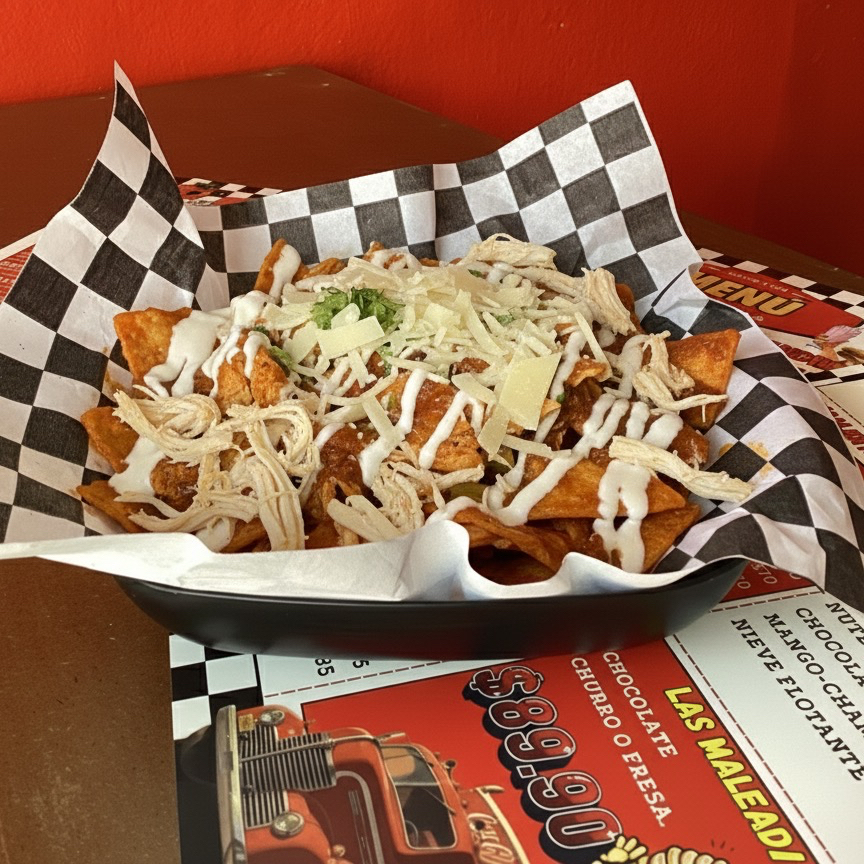 Chilaquiles con salsa roja, bañados con queso Gouda, crema, cebolla y pollo