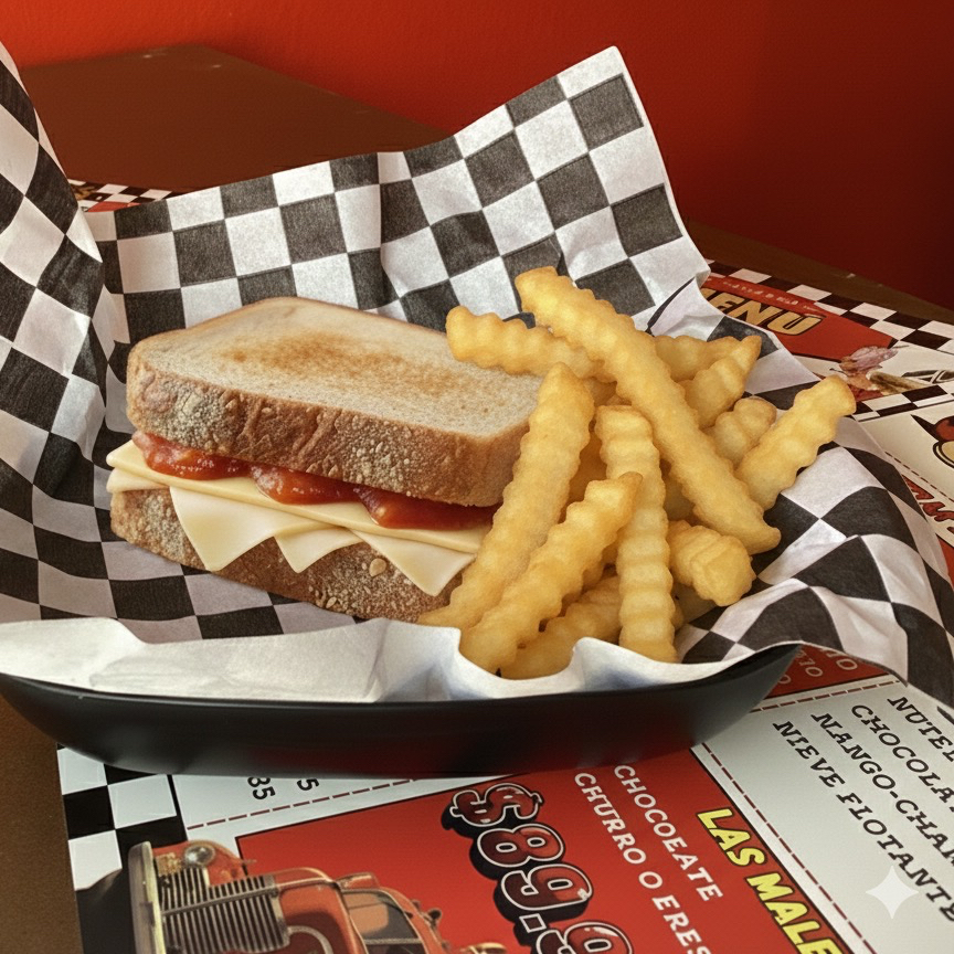 Sándwich con mantequilla de ajo, tres quesos, acompañado con dip de jitomate