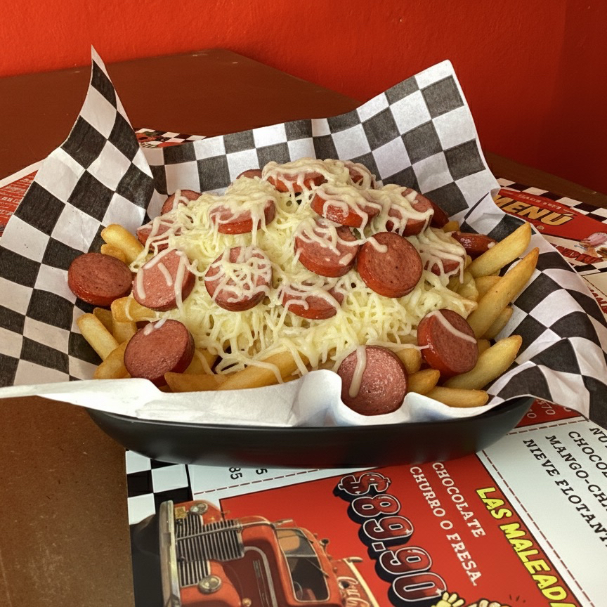 Papas fritas con salchicha, bañadas en queso Gouda