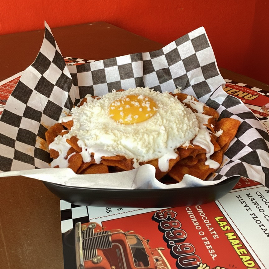 Chilaquiles bañados en salsa roja, queso Gouda, crema, cebolla y huevo estrellado