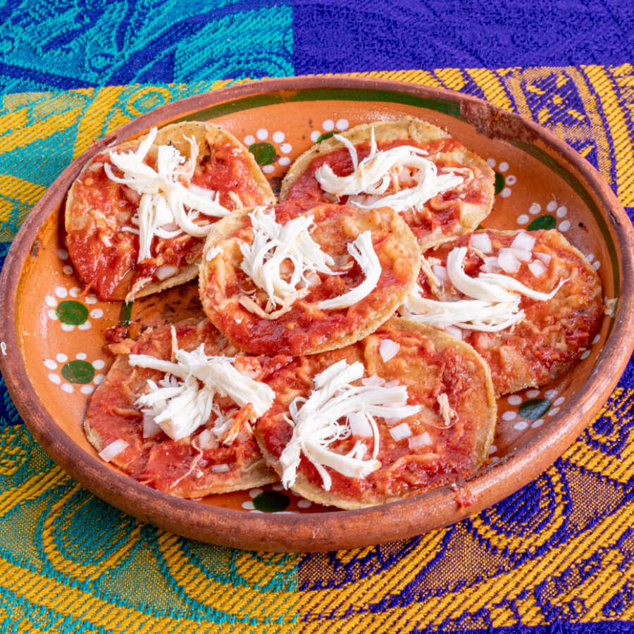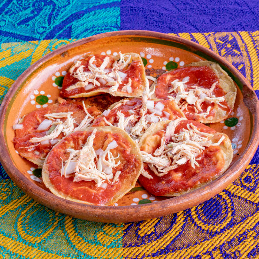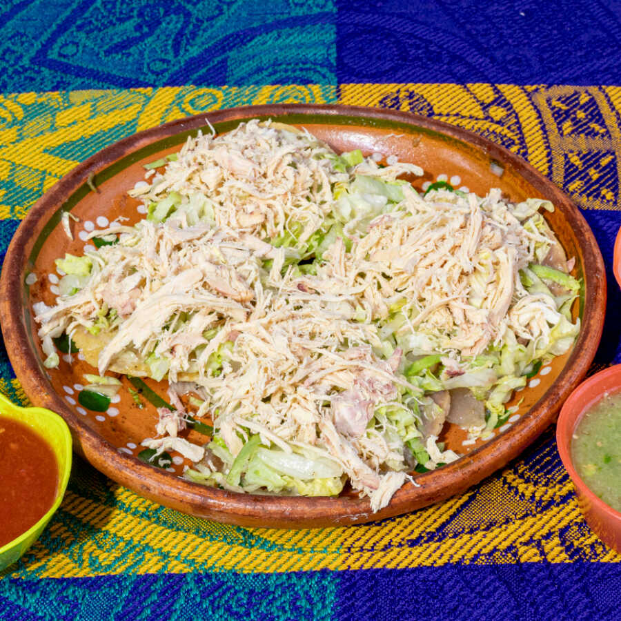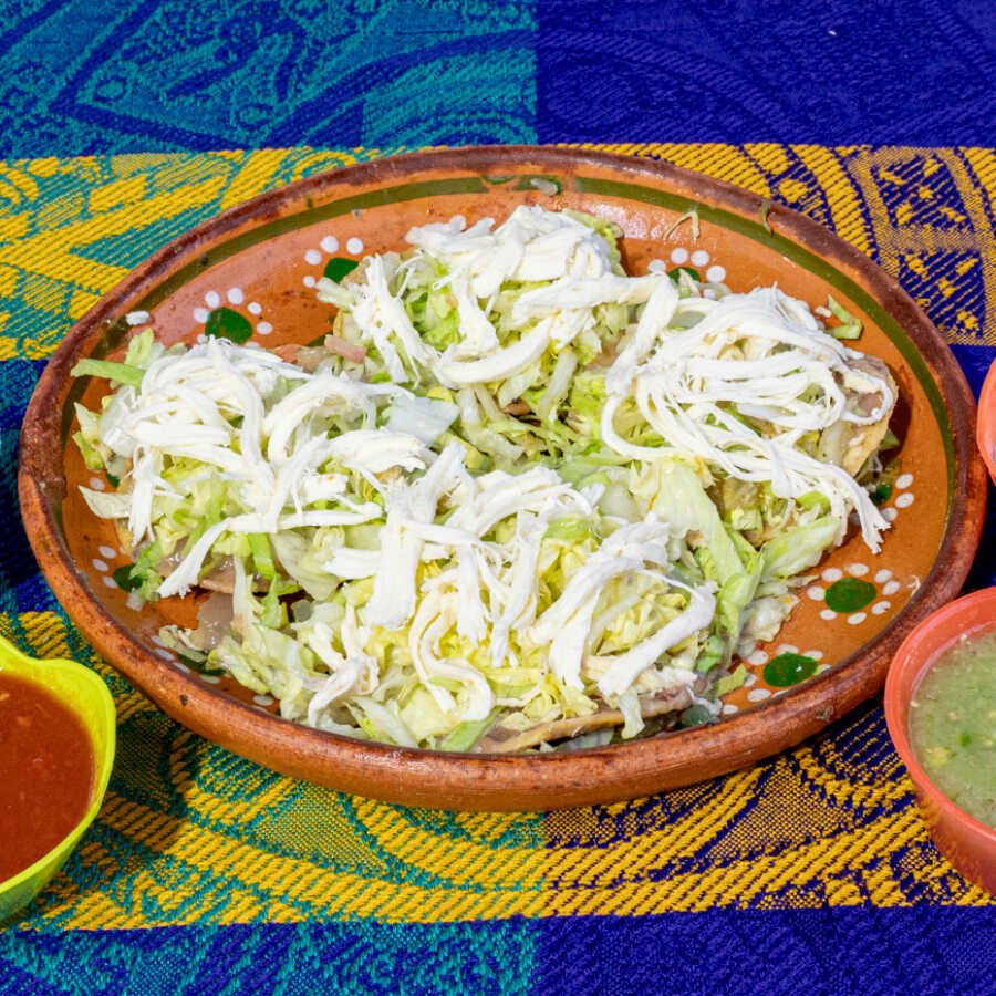 Pollo lechuga rábano cebolla limon orégano chile en polvo tostadas