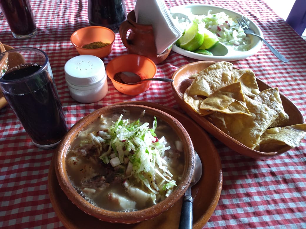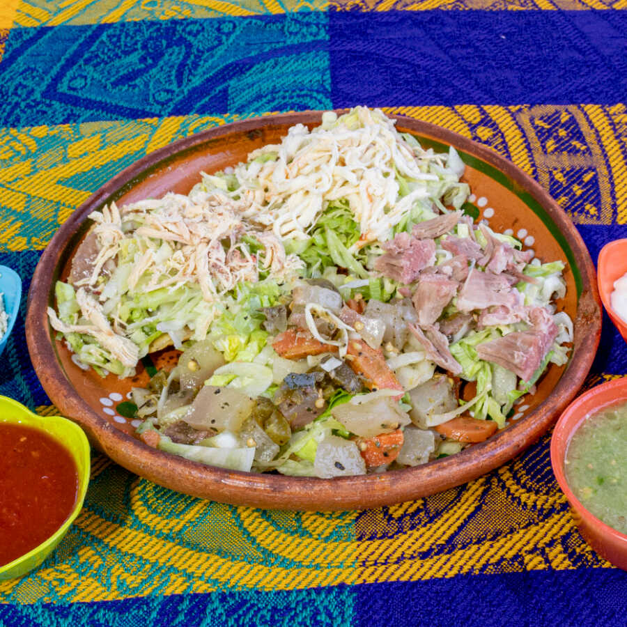 Cabeza de cerdo Lechuga rábano cebolla limon orégano chile en polvo tostadas