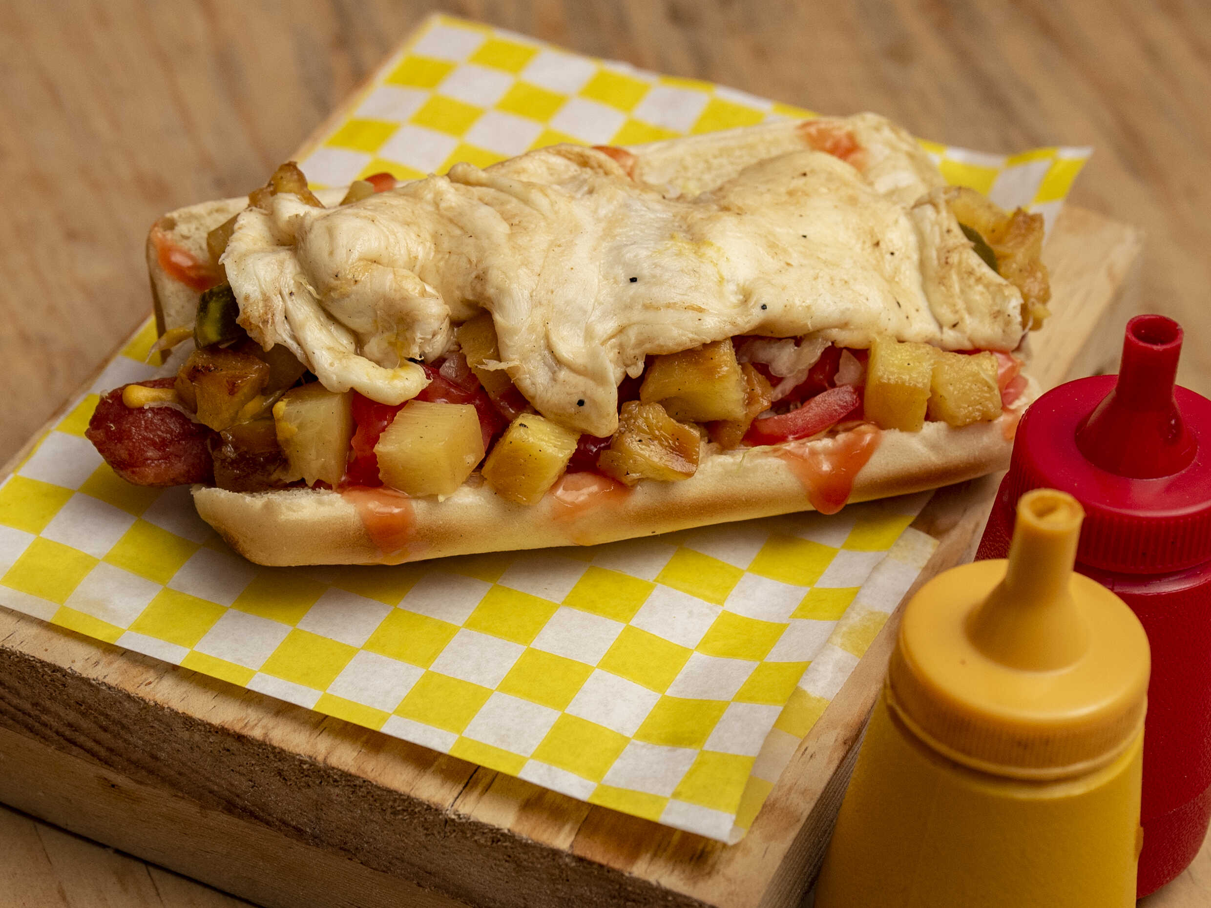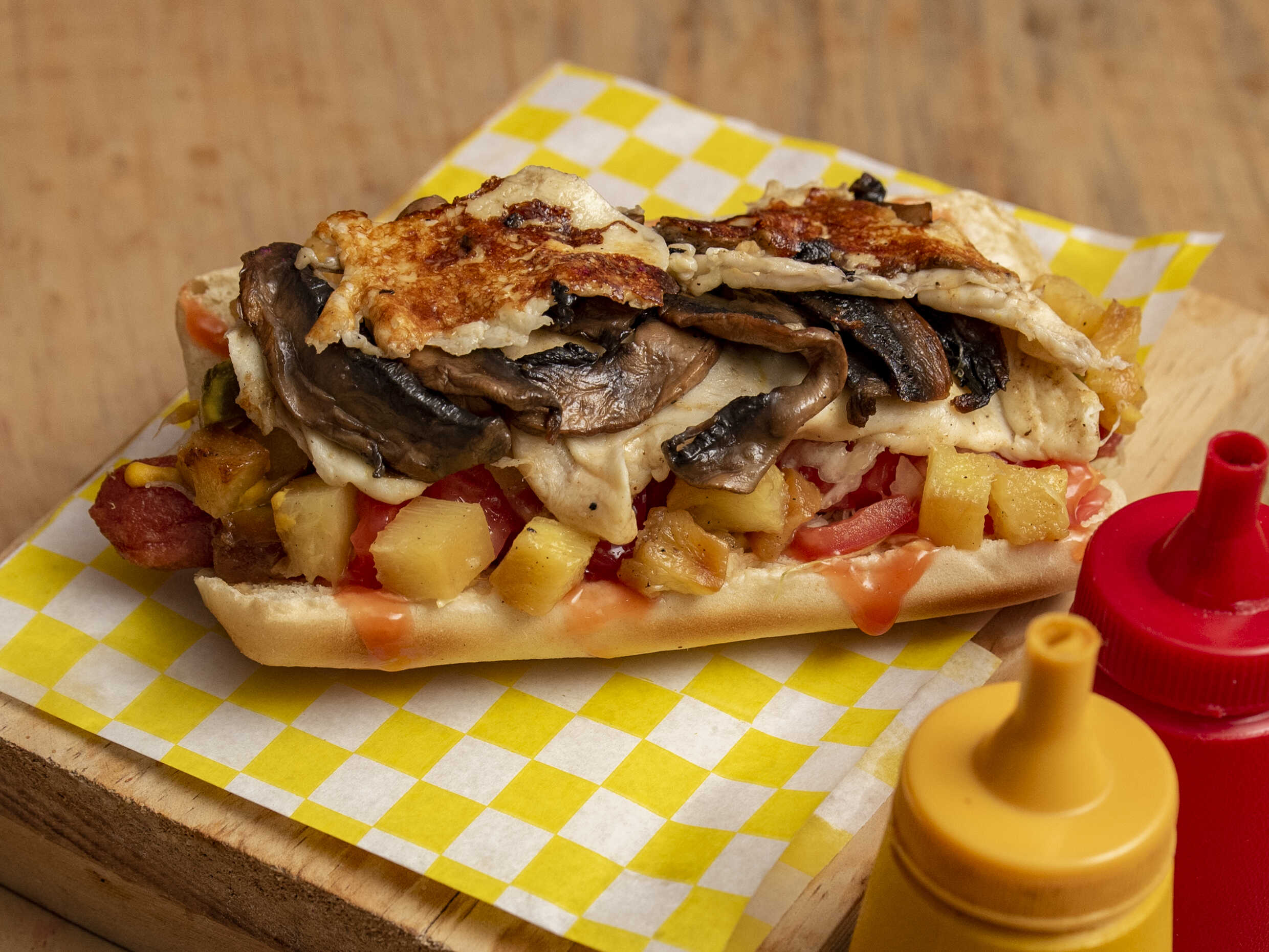 icioso hot dog estilo americano acompañado de salchicha mayonesa catsup jitomate mostaza lechuga cebolla piña y quesillo y champiñon y manchego