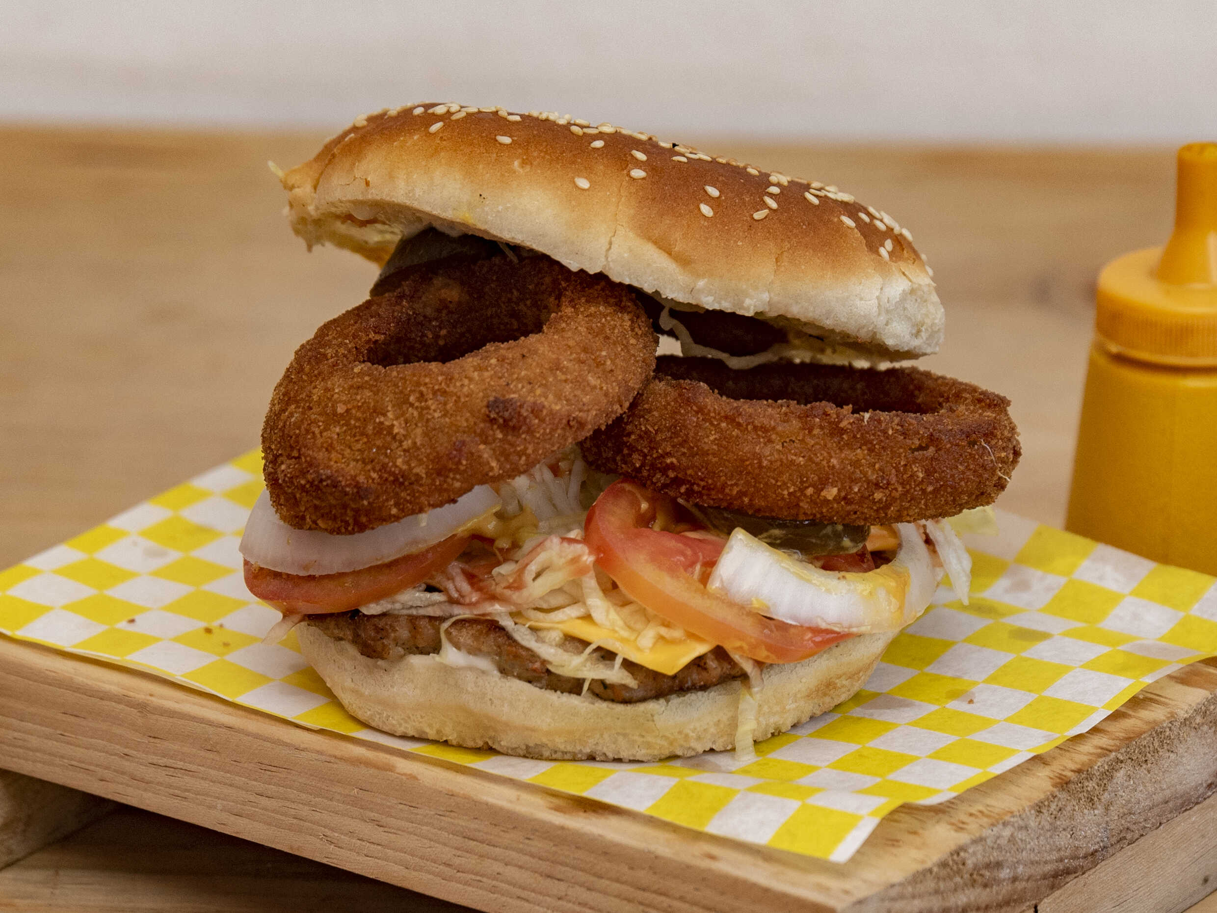 suculenta carne acompañada de queso americano,lechuga,jitomate,cebolla,mayonesa,mostaza ,jalapeños,aros de cebolla empanizados. .