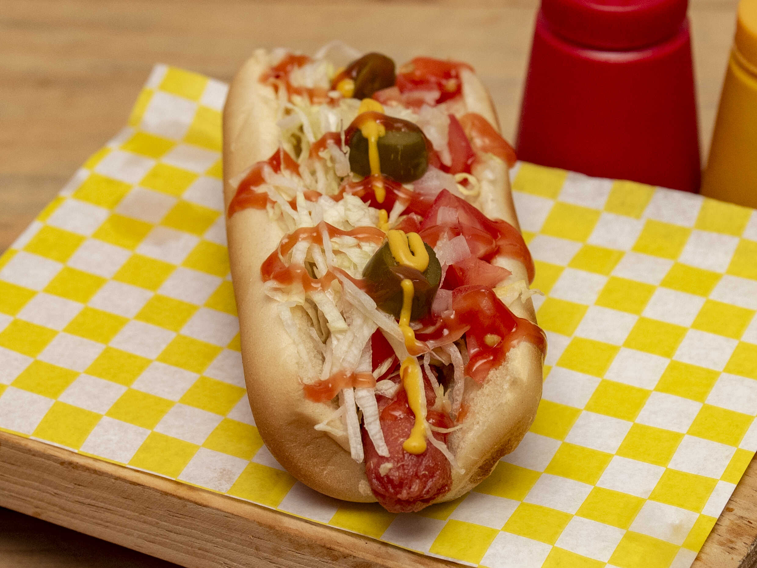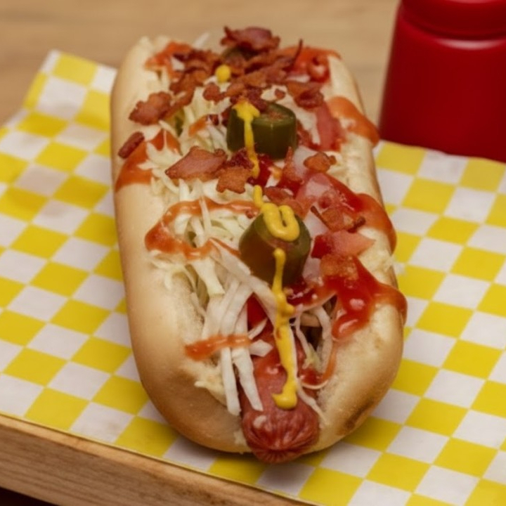 delicioso hot dog estilo americano acompañado de mayonesa salchicha jalapeños jitomate lechuga catsup piña y cebolla.