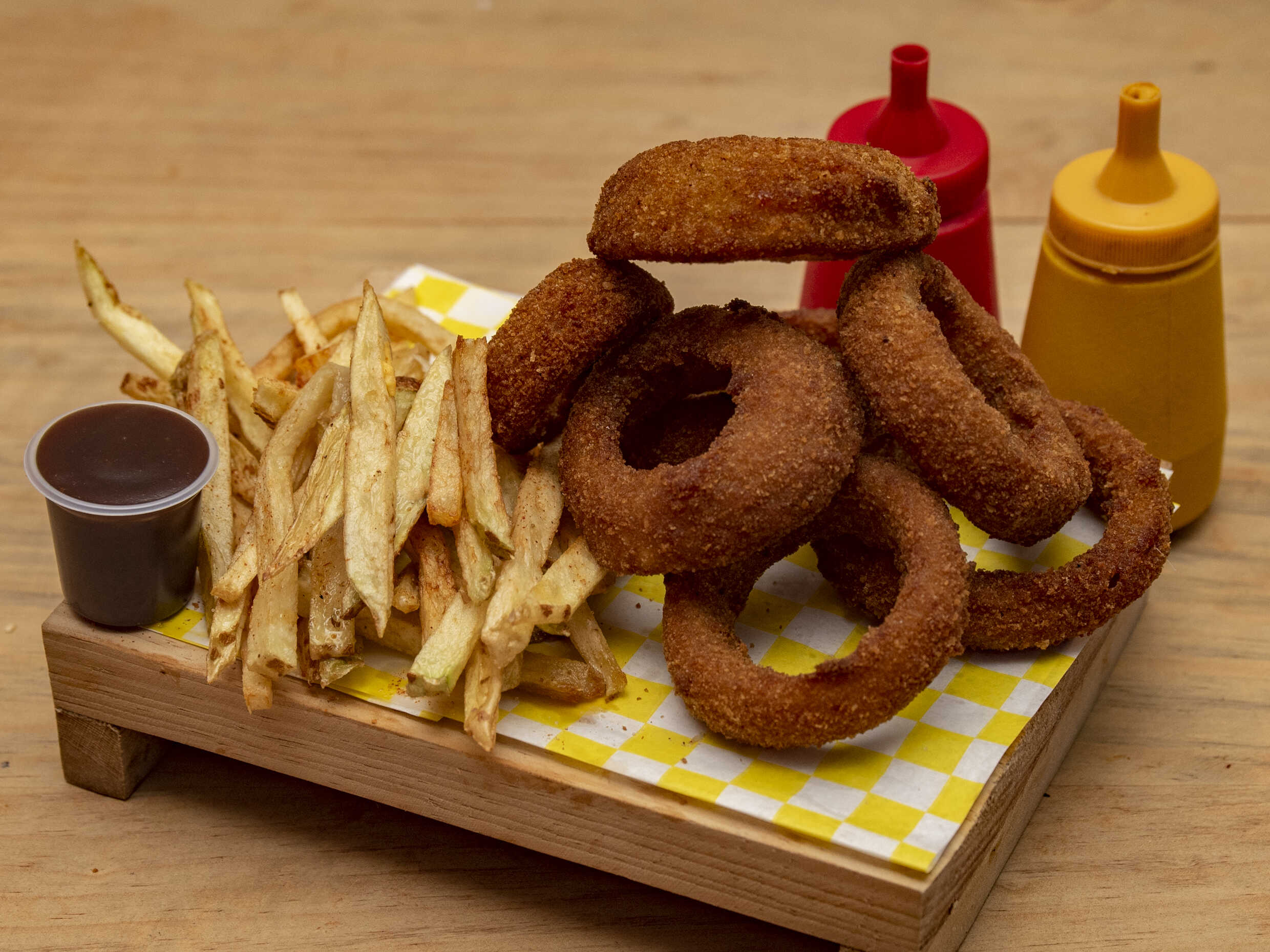 3 aros de cebolla empanizados+3 dedos de queso+3 bonelles de pollo+orden de papas+3 alas