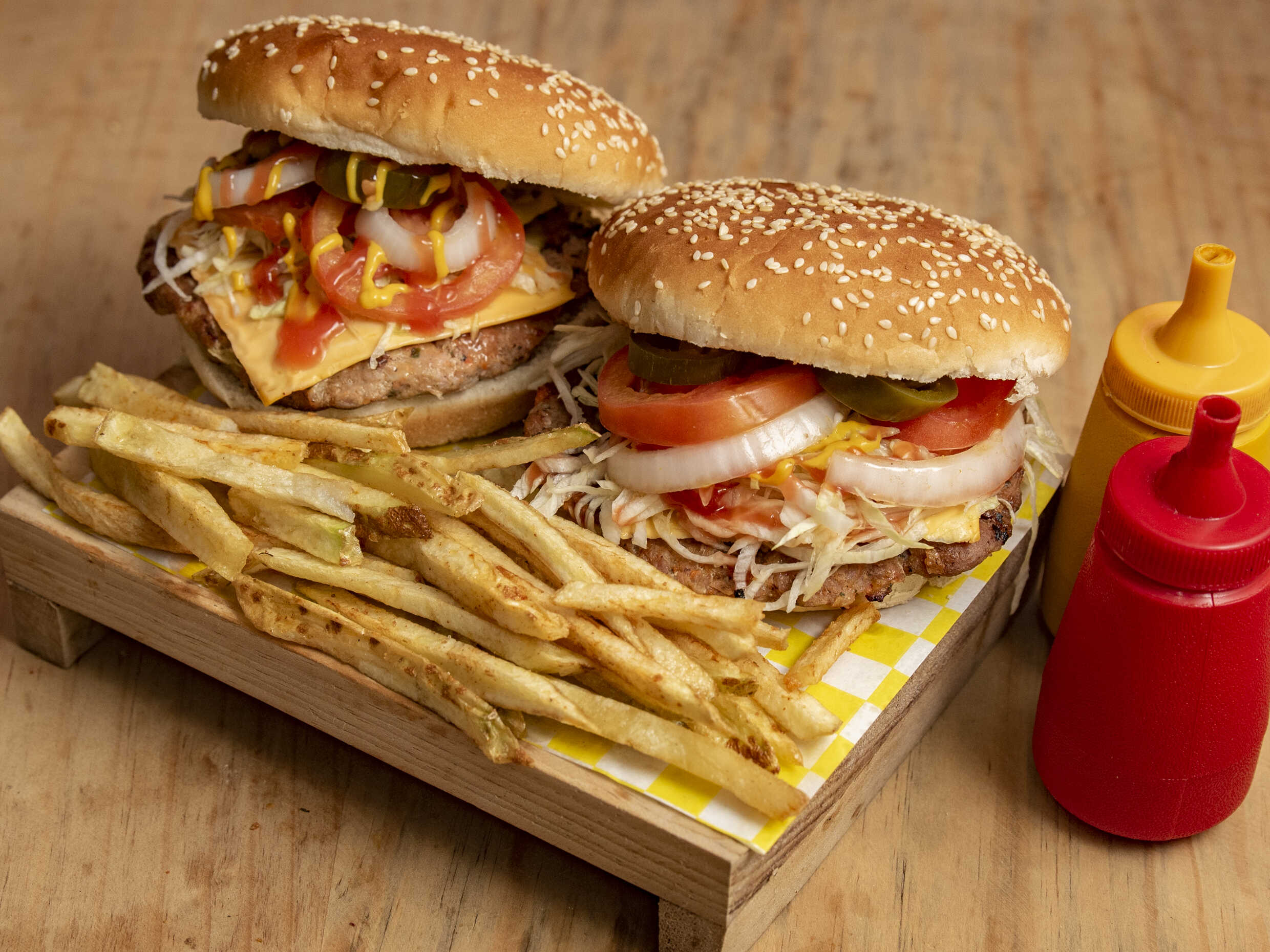 suculenta carne tres capas de queso en cada carne acompañada de queso americano,lechuga,jitomate,cebolla,mayonesa,mostaza ,jalapeños, quesillo.