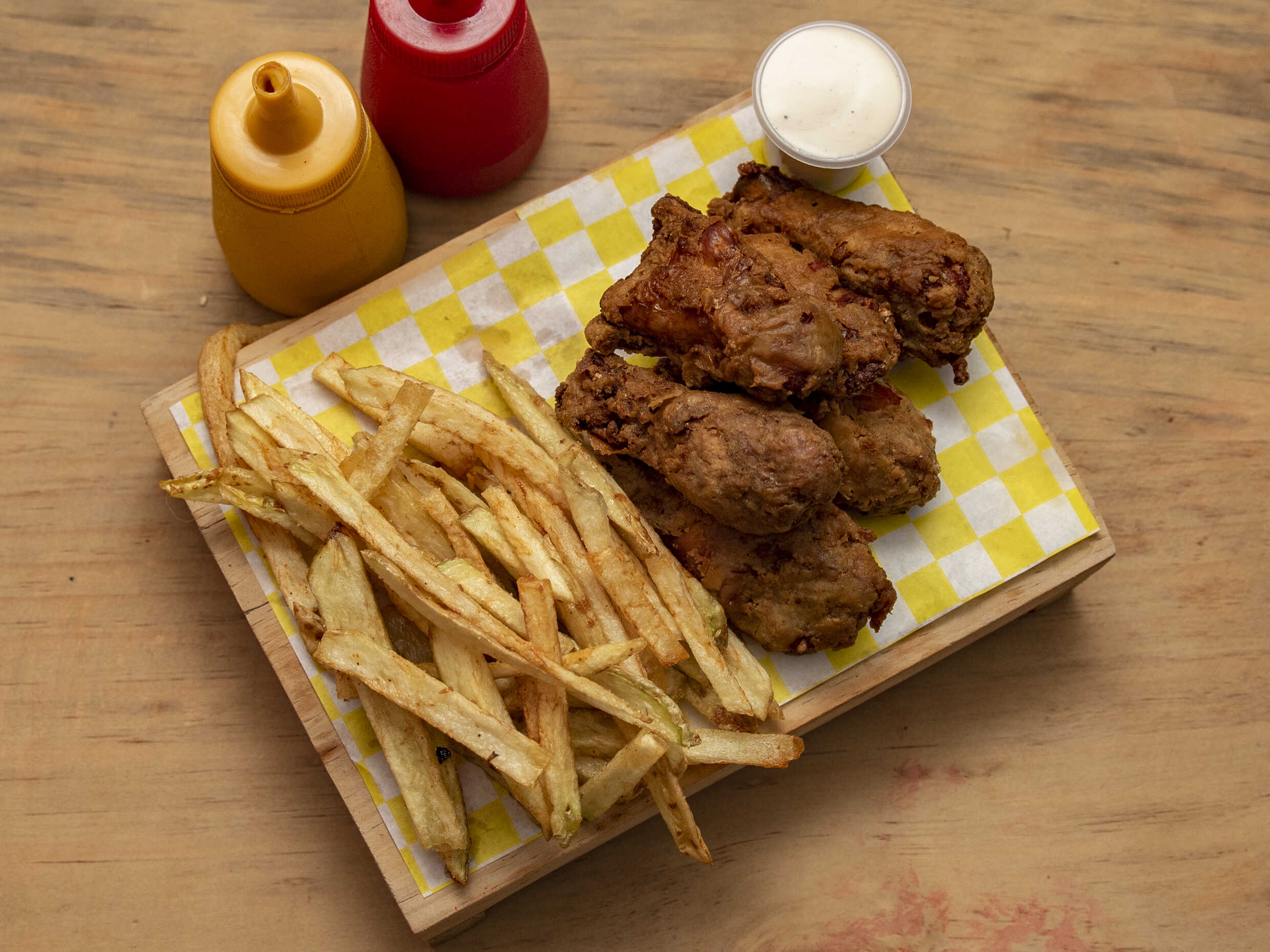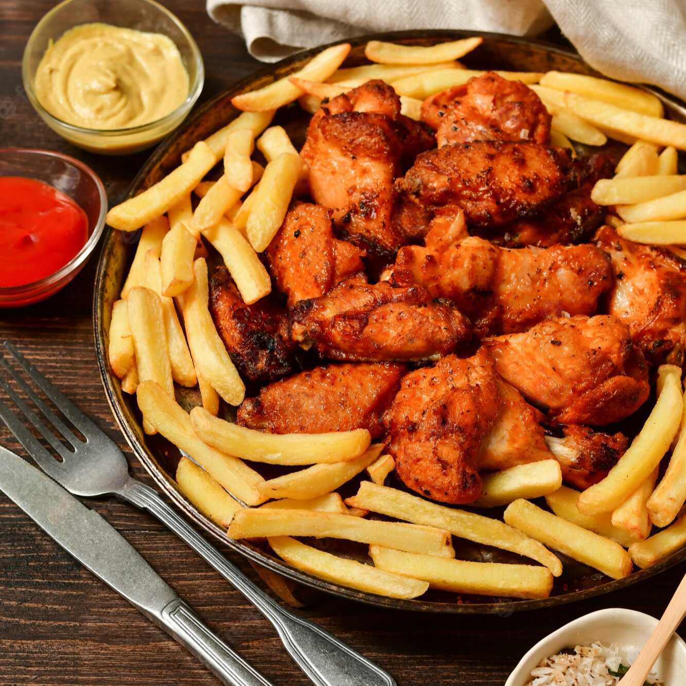 alitas de pollo bañadas en salsa de tu eleccion acompañadas de papas fritas naturales