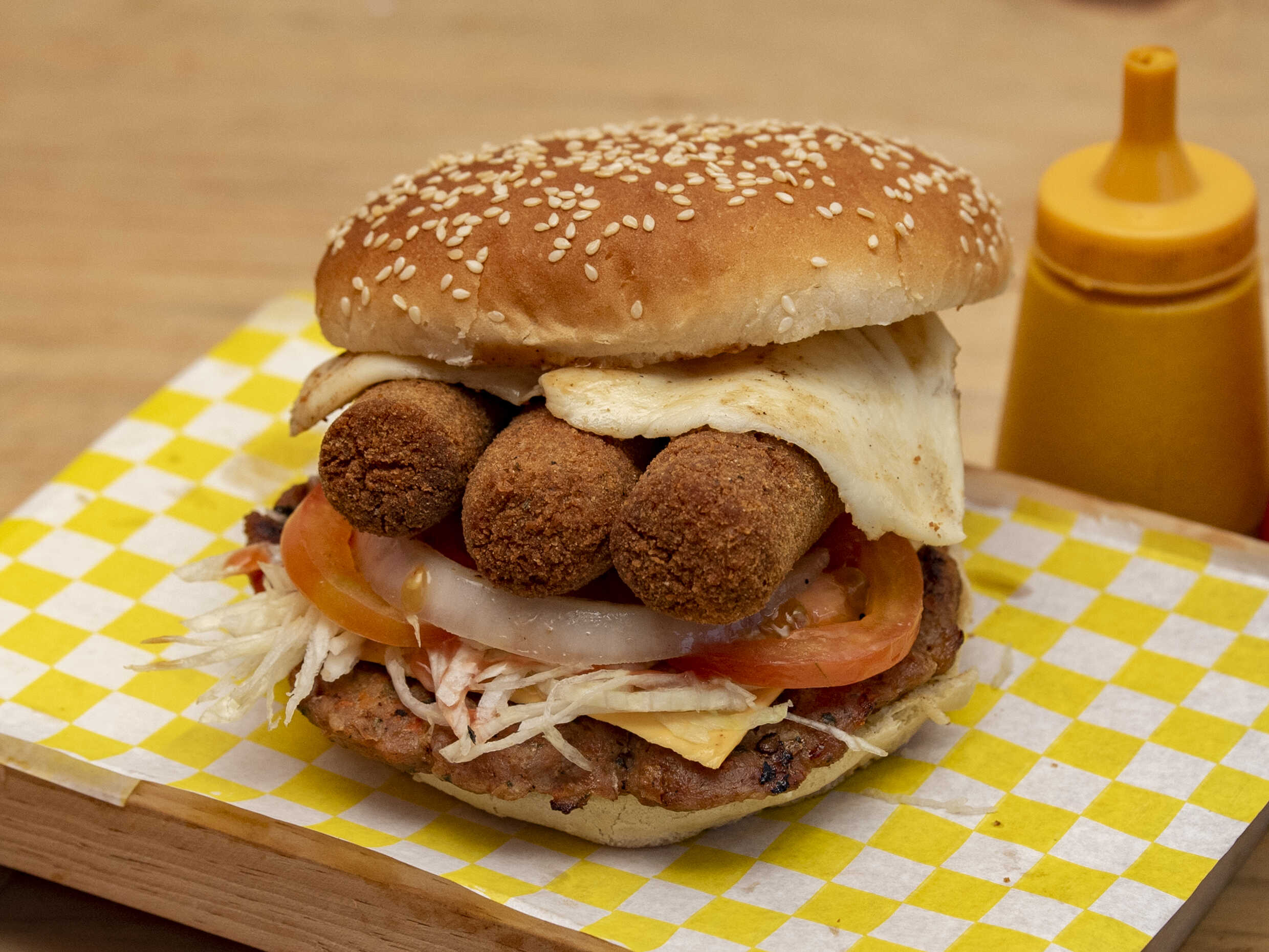 doble porcion de carne acompañada de queso americano,lechuga,jitomate,cebolla,mayonesa,mostaza ,jalapeños, quesillo,dedos de queso mozarella,manchego,piña.