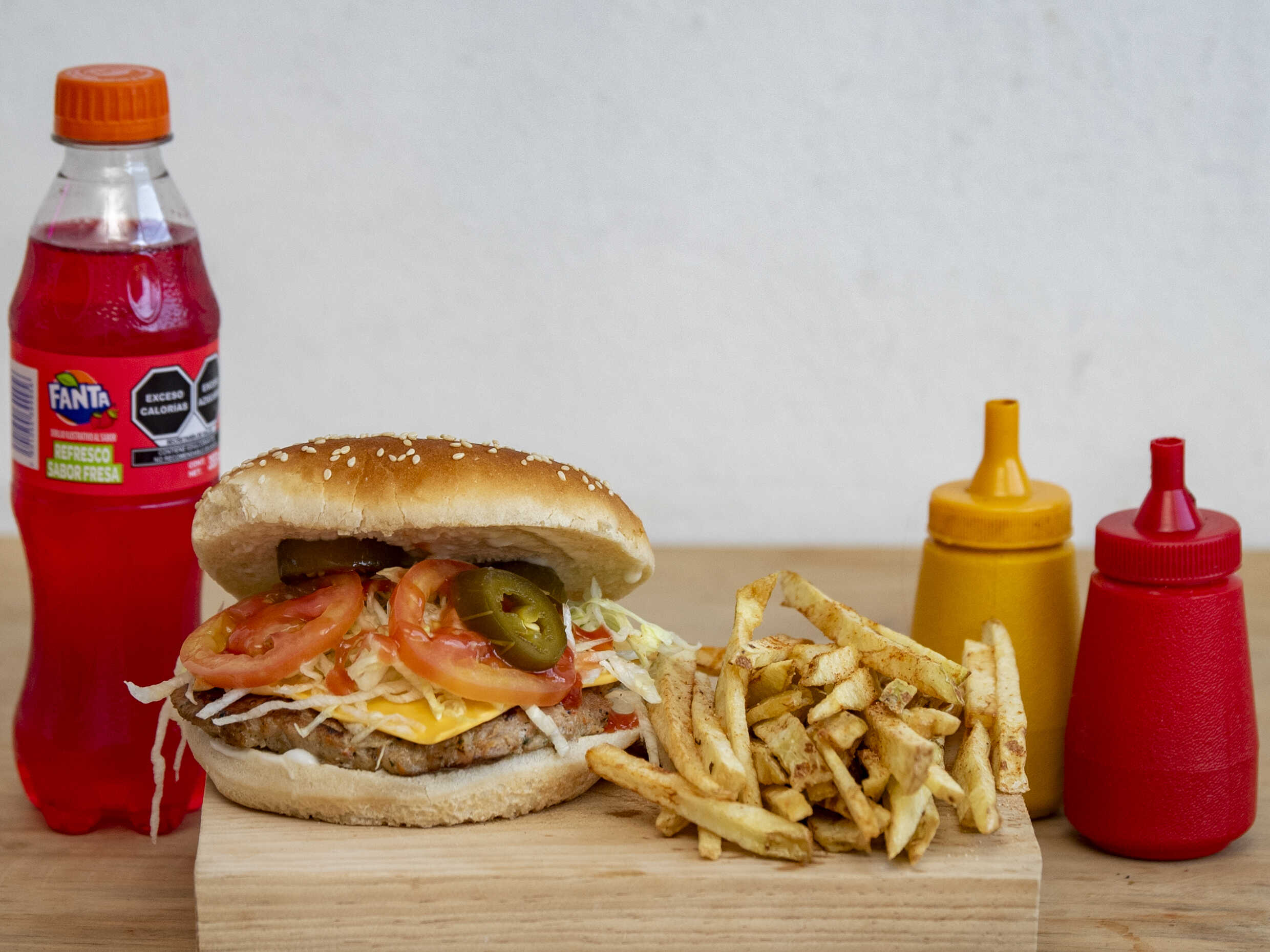 suculenta carne acompañada de queso americano,lechuga,jitomate,cebolla,mayonesa,mostaza ,jalapeños, acompañada con dedos de queso.