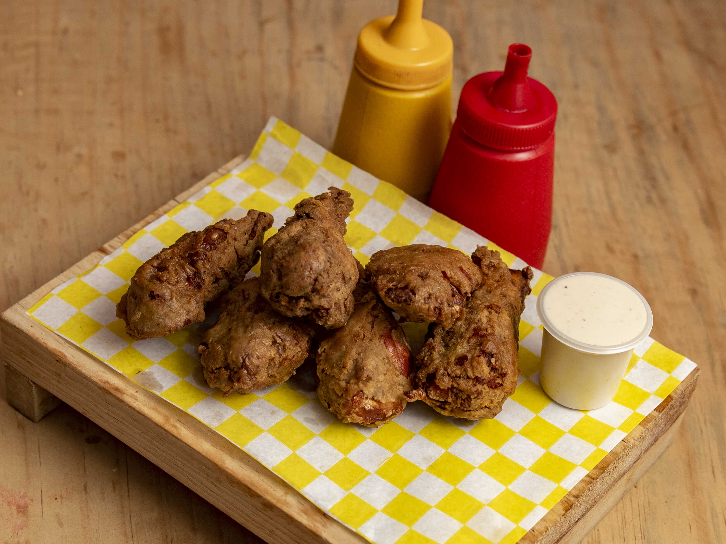 crujientes por fuera y suaves por dentro piezas de pollo acompañadas de tu aderezo favorito