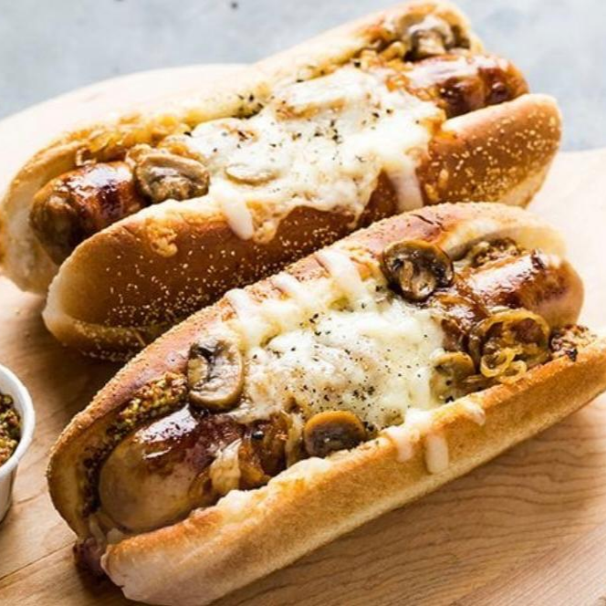 PAN CASERO, SALCHICHA FRANKFURT, JAMON AMERICANO, QUESILLO, CHAMPIÑONES, TOCINO Y ADEREZO DE LA CASA