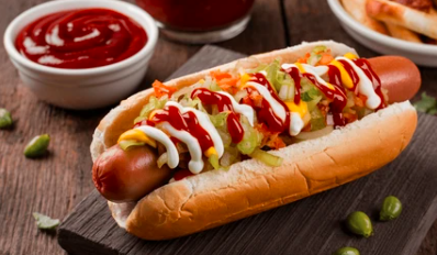 Salchicha rellena de queso, mayonesa, cátsup, mostaza, cheez whiz, jitomate y cebolla caramelizada.