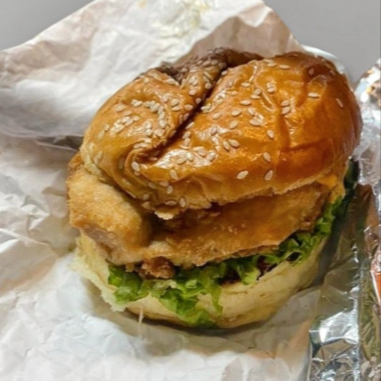 Hamburguesa con 120 grs de carne de Pollo, mayonesa, cátsup, mostaza, queso amarillo, lechuga, cebolla caramelizada, queso americano y quesillo.