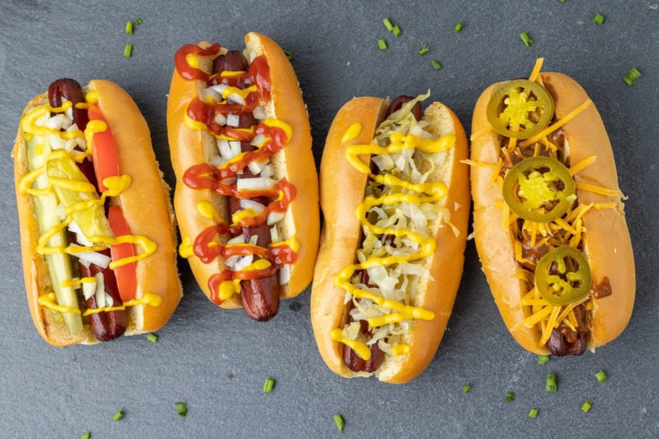 Salchicha de res con tocino y mayonesa, cátsup, mostaza, cheez whiz, jitomate y cebolla caramelizada.