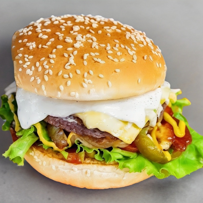 Doble carne de hamburguesa, doble queso, cebolla caramelizada, lechuga, y aderezo.
