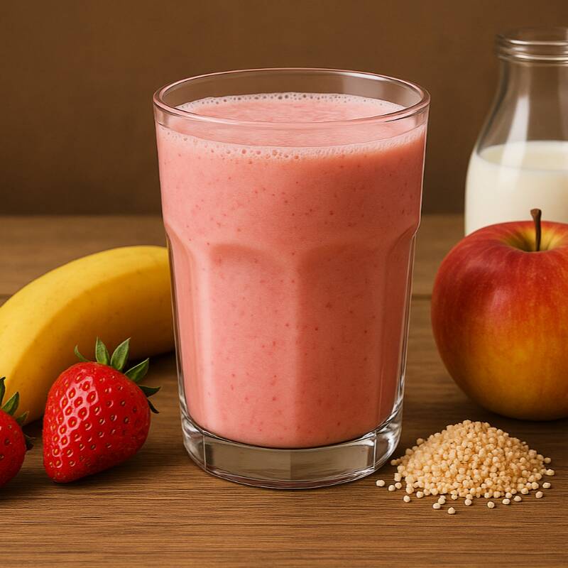 Licuado de Fresa, Plátano, Manzana, Amaranto, Almendras, Miel y Leche Deslactosada
