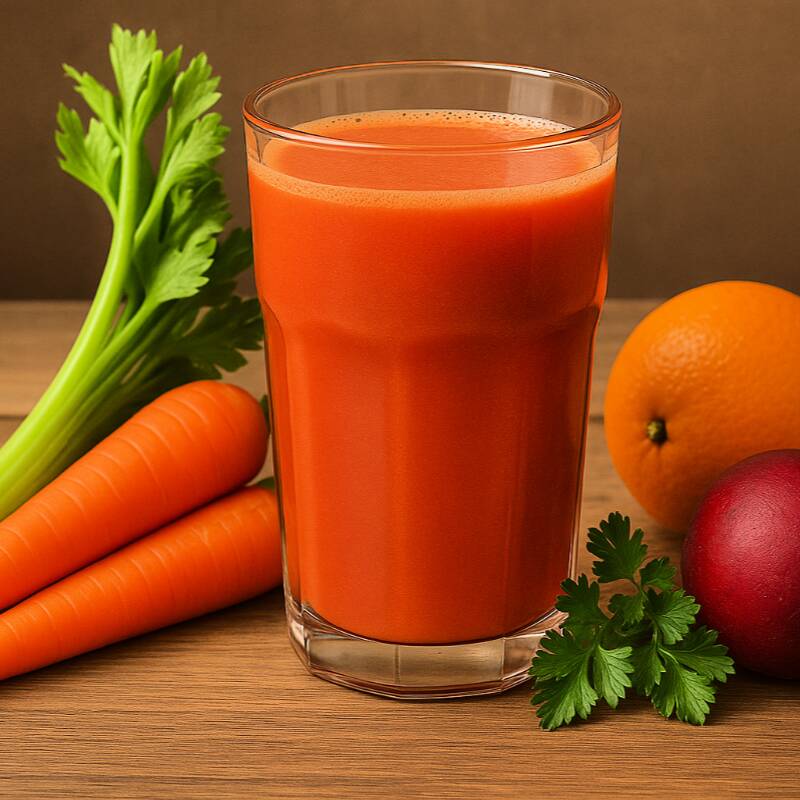 Jugo de Zanahoria, Apio, Manzana, Betabel, Perejil y Naranja
