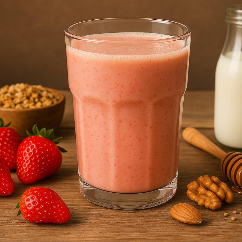 Licuado de Fresa, Granola, Nuez, Amaranto, Miel y Leche Deslactosada
