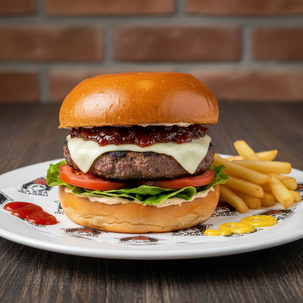 Pan brioche, aderezo de la casa, carne de res, queso, mermelada de tocino, lechuga, rodajas de jitomate, salsa catsup y mostaza. (Imagen ilustrativa)