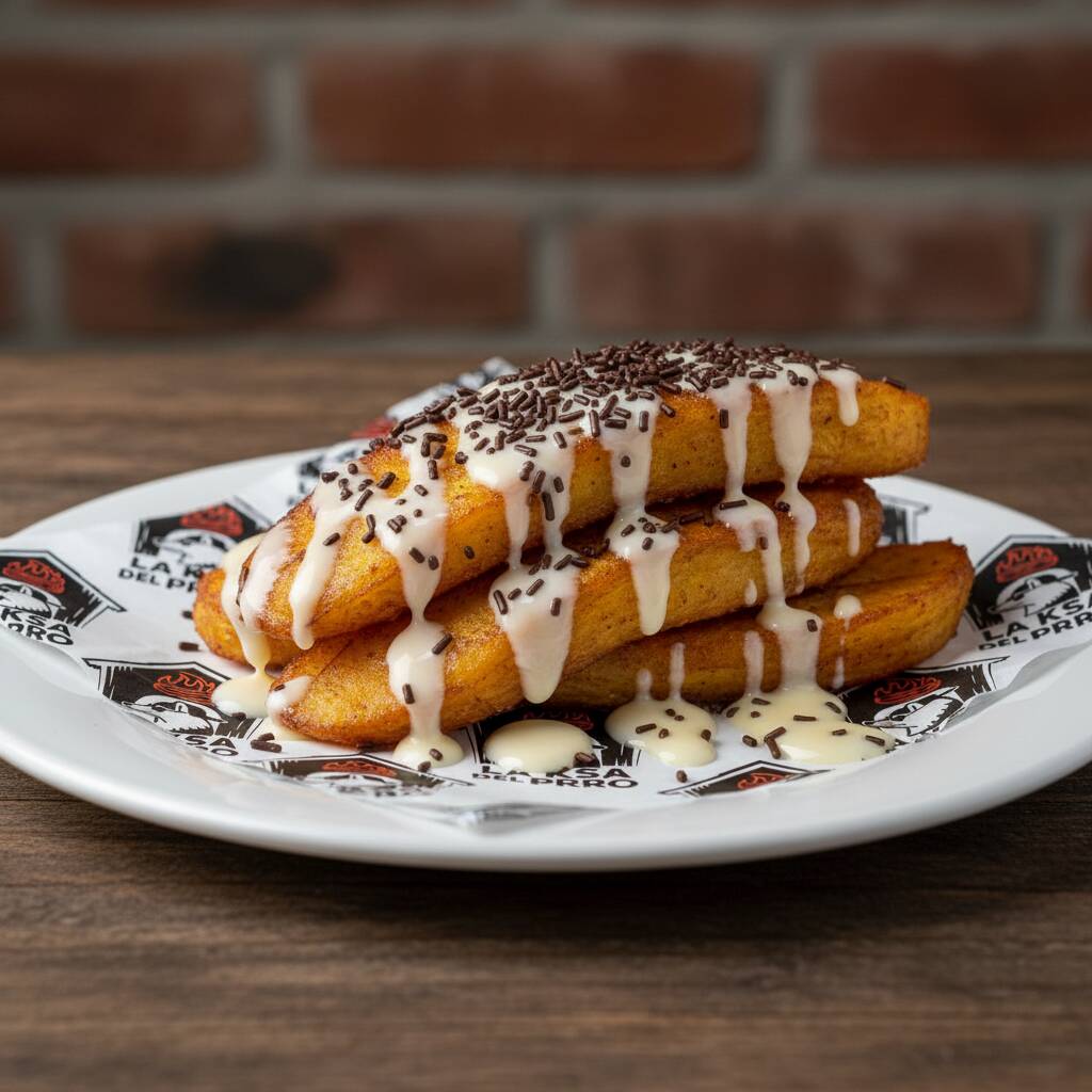Porción de platano macho frito con leche condensada y granillo de chocolate. (Imagen ilustrativa)