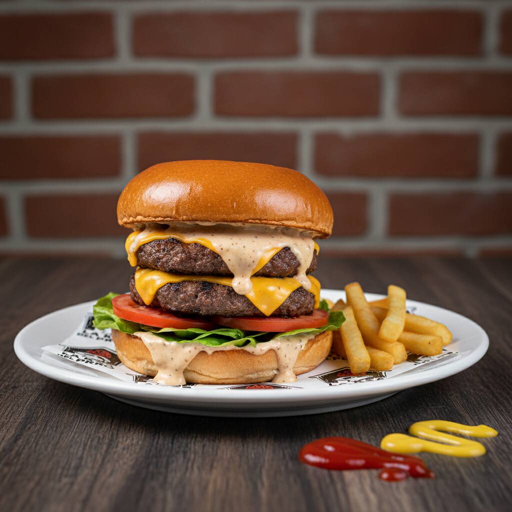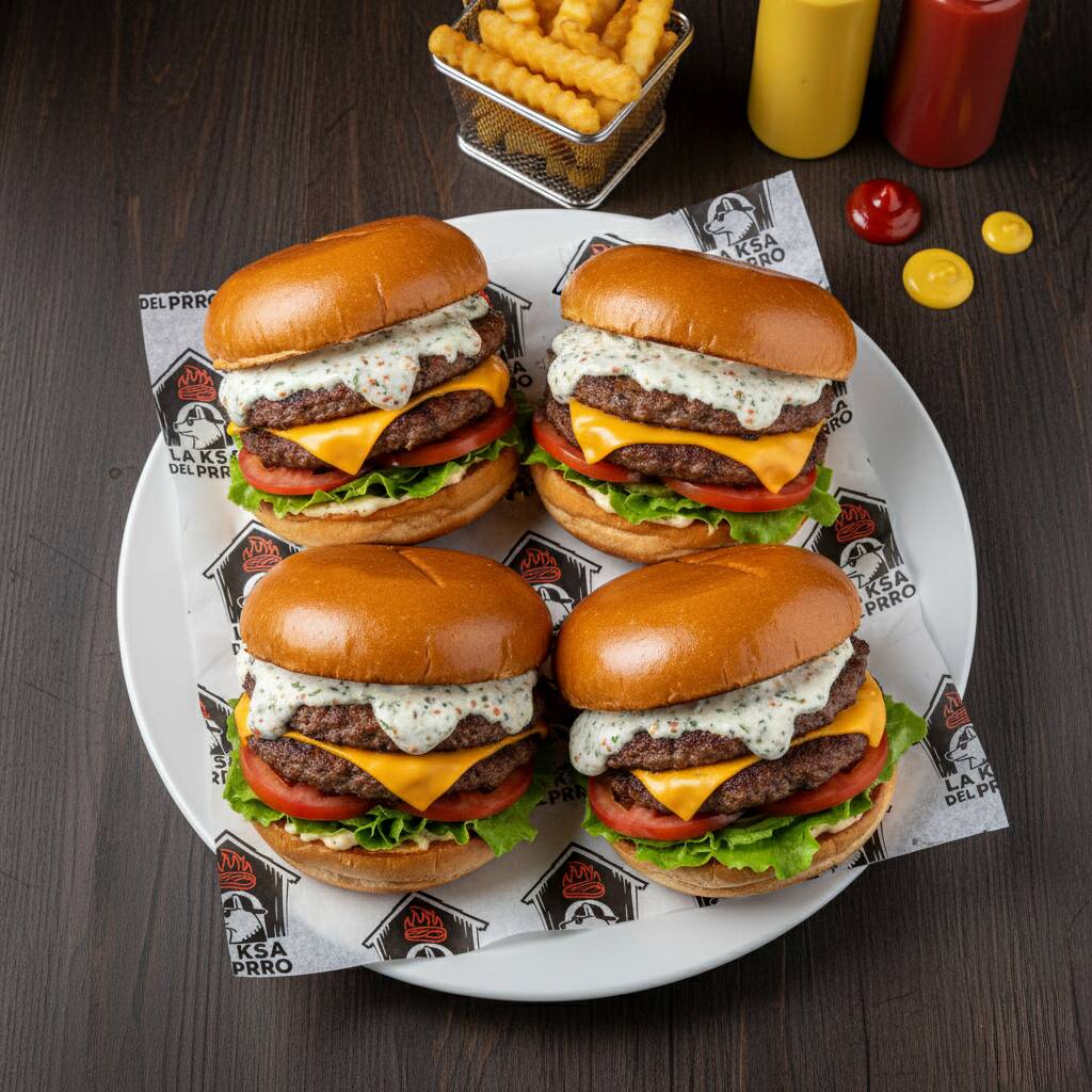 Pan brioche, aderezo de la Ksa, doble carne de res, doble queso, aderezo con “pdigree”, lechuga, rodajas de jitomate, salsa catsup y mostaza. (Imagen ilustrativa)