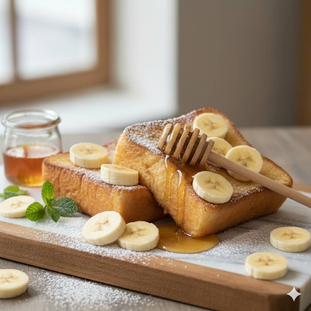 Dos rebanadas de pan frito con plátano y miel natural. (Imagen ilustrativa)